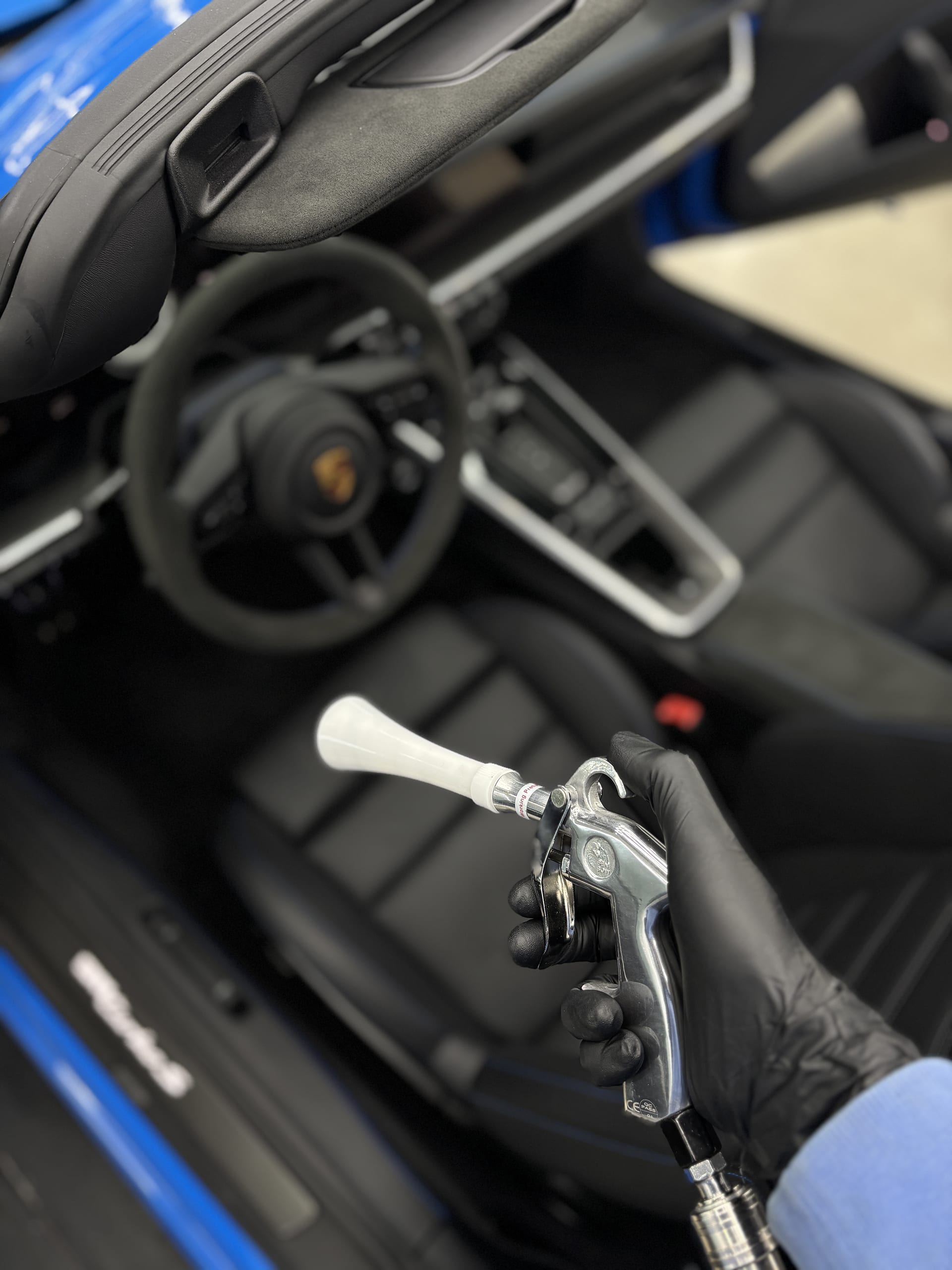 Екстериорът преминава през детайлно измиване и почистване с pH-неутрални препарати, безопасни за керамични покрития, а интериорът – през повърхностно почистване и освежаване на всички зони, включително седалките и багажното пространство.